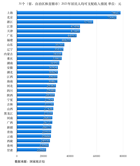 国家统计局最新公布的31个省(自治区、直辖市)2021年居民人均可支配收入数据显示,北京、上海突破7万元大关,有8个省份超过全国35128元的平均水平,均在东部地区。