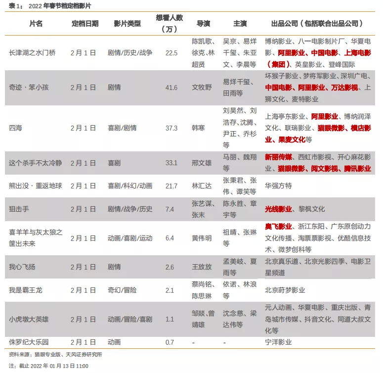 [3]《22年电影春节档前瞻:强档期效应预计持续,关注优质内容弹性》,天风证券