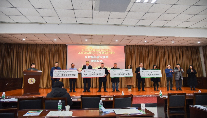 1月20日,为贯彻落实中央、四川省及成都市委市政府实施乡村振兴战略的决策部署,推动彭州农村金融改革与普惠金融服务乡村振兴工作有效衔接,彭州市财政局(市国资金融局)、彭州市国资金融服务中心、市农业农村局、人民银行彭州市支行联合召开“彭州市金融服务乡村振兴工作总结暨2022年融资对接会”。辖内11家银行与涉农企业代表签订了授信协议,授信总金额达52.95亿元,现场收集对接21户新型农业经营主体融资需求1680万元。