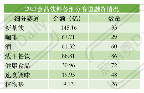 就食品饮料赛道而言,在其各大细分赛道中,融资数量排在首位的,无疑是今年无比火热的线下餐饮;从融资金额来看,新茶饮是当之无愧的第一。