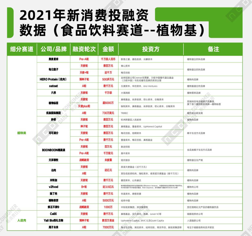当然,即使植物肉看似在中国“行不通”,但植物基的过亿融资项目都是植物肉,一个是「谷肉」一年完成总计近亿元的两轮融资;一个则是「v2food」,B+轮融资拿下近3.5亿元。