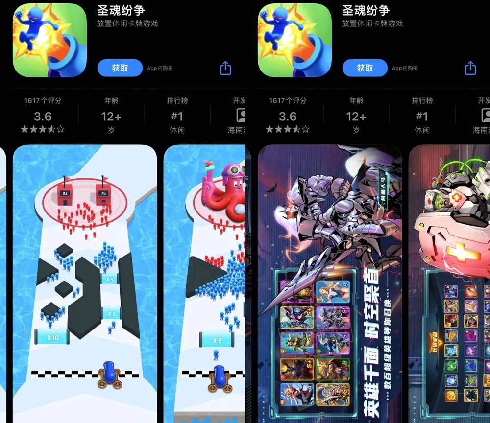 除了抄袭山寨这种明确违法行为外,在违规情况上的操作更是骚瞎了玩家的眼睛。在苹果App Store上有一款名为《圣魂纷争》的手游,从游戏的icon和商店游戏截图来看,这款游戏正是不少应用广告中曾出现过的IAA游戏,下载了这款游戏的玩家同样可以体验到商店截图中的休闲玩法,但是当几关过后,这款披着IAA游戏外壳的手游终于变成了它应该的样子,而这个游戏的真实样子正是它商店展示图片中后几幅图的样子。