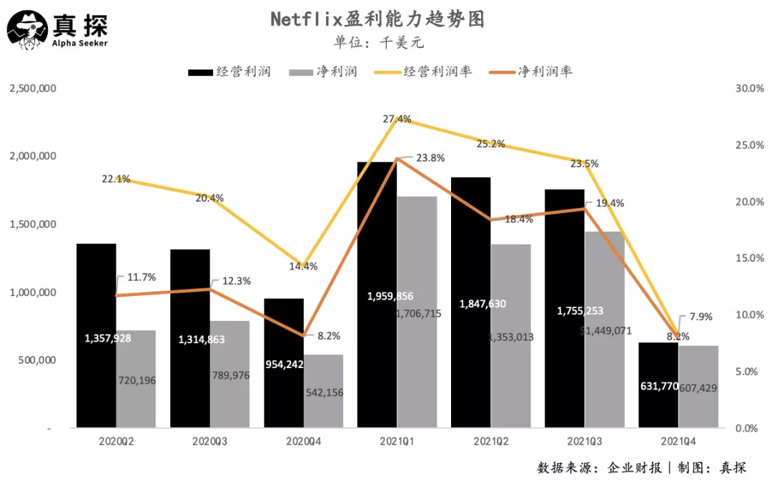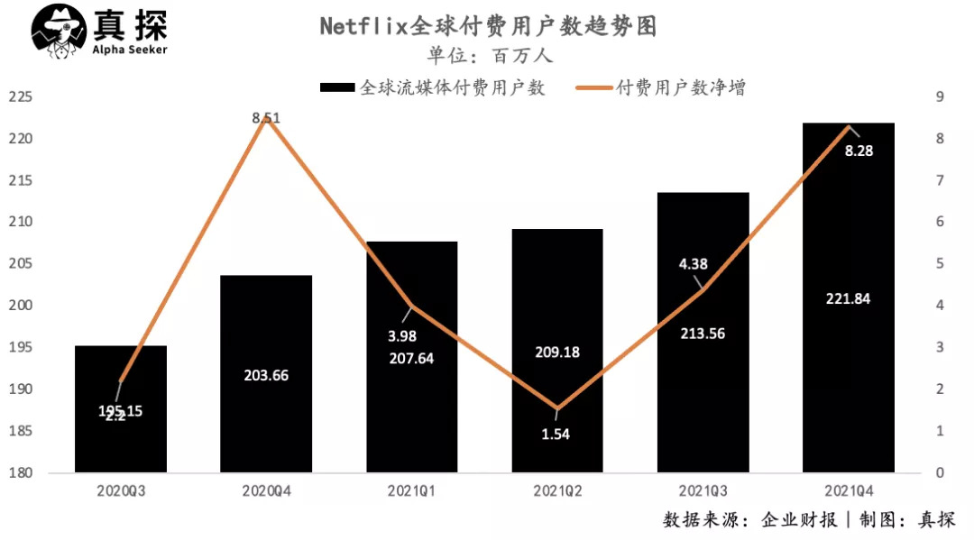 对2022年Q1新增用户数的展望是最令人失望的数字,Netflix预计的250万新增用户数大幅低于市场预期。财报发布后,Netflix盘后大跌近20%。