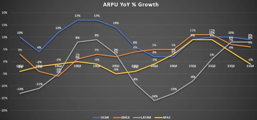数据显示,2021年四季度美国和加拿大地区(UCAN)的ARPU为14.78美元,较上年同期的13.51,增长9%,与上一季度的14.68美元几乎无变化;