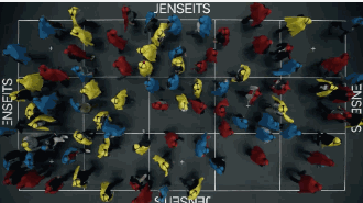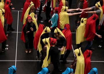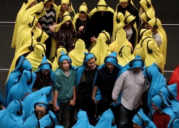 比如,找来一群素未谋面的陌生人,一人发一件彩色斗篷和一个耳机,听着指示团团转: