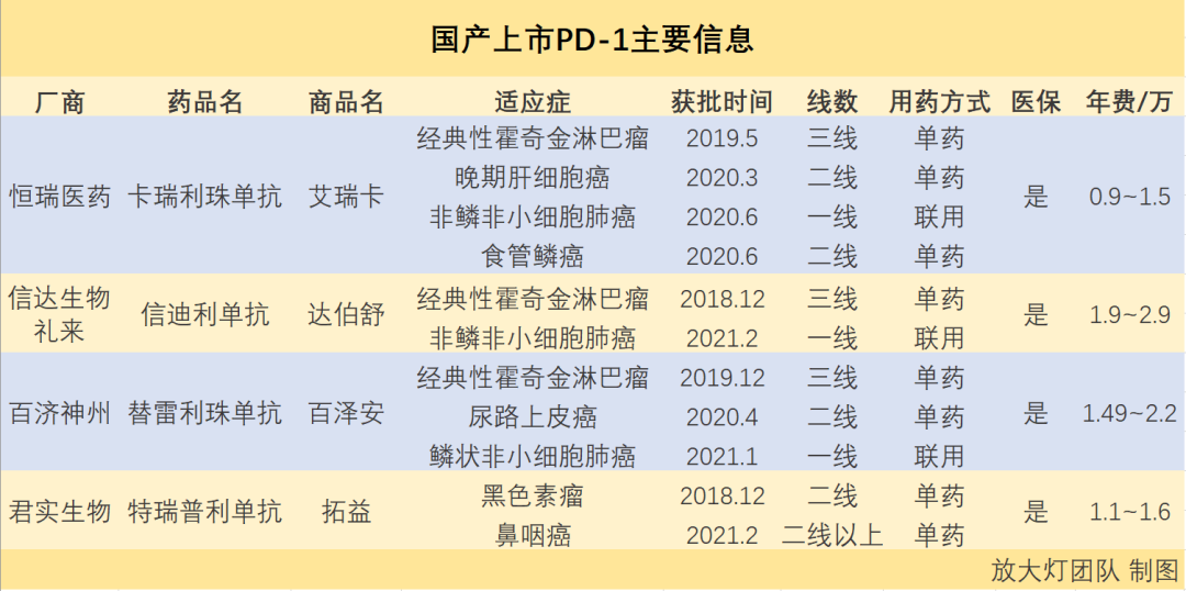 同时也架不住单价高,二者在国内治疗价格一年超过三十万,这个价格不是一般病人能负担起来的。如果要击破这种进口药凌驾的局面,国内的抗癌创新药不仅要跟上技术,还要从价格层面降维打击,2018年到2019年,两年之内上市了三家国产PD-1单抗。