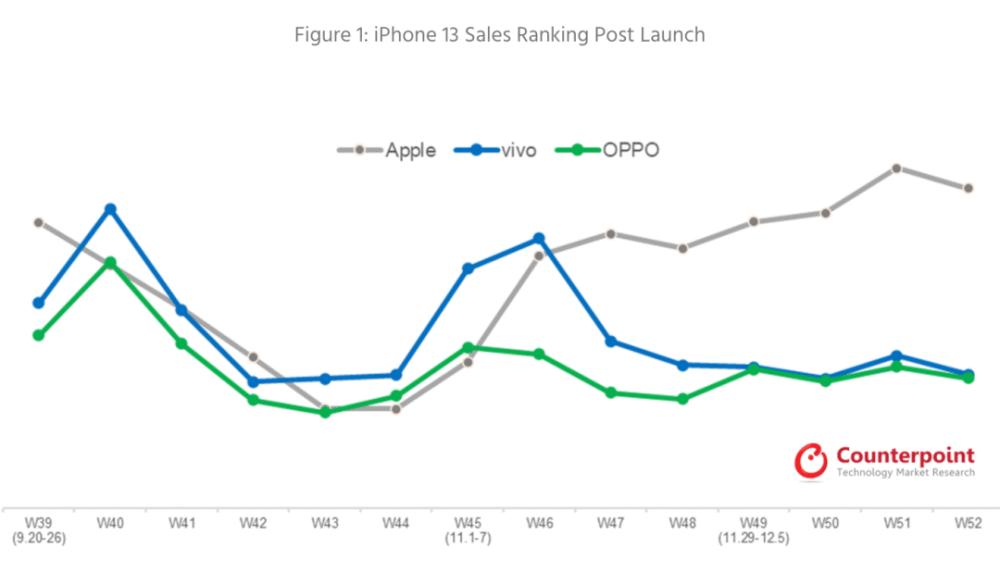 让我们将目光稍微放回国内市场,根据市场调研机构Counterpoint Research发布的数据显示,在苹果iPhone 13系列开卖以来的三个月时间里面,苹果夺得9次周冠,最近更是连续6周在中国市场销量中排名第一,与中国厂商vivo、OPPO之间的差距持续拉大,稳居龙头位置。