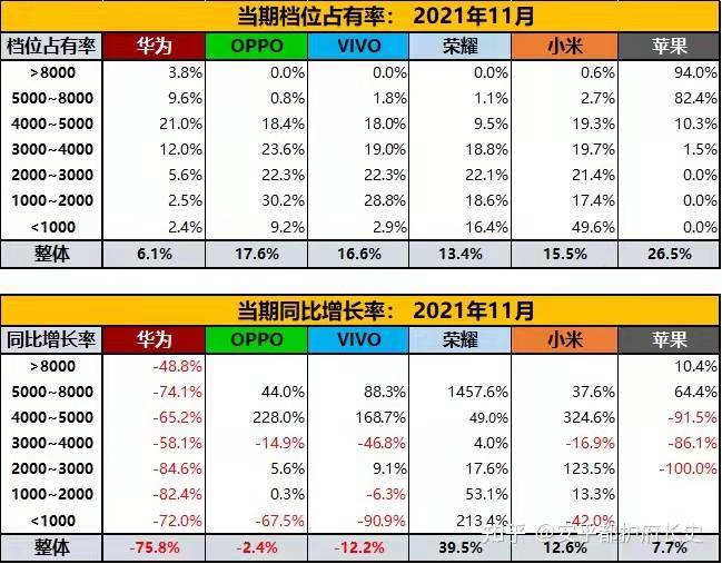 从安乎都护府长使提供的《2021年11月国内零售数据》来看,苹果在8000+档位的市场份额疯狂飙升到了94%,在5000-8000档位的市场份额也达到了82.4%,对比去年同期上升644%。显然,在没有了华为的情况下,高端市场已经没有任何什么企业可以制衡苹果了。