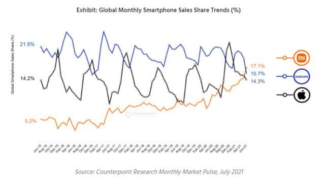 要说去年在全球市场发展最快的国产厂商,那肯定是小米。根据Counterpoint Research发布的数据显示,去年年中,小米全球销量占比一度达到17.1%,超越三星和苹果,成功跃居全球第一。即便在其他研究机构发布的半年度、季度数据中,三星也只能够凭借小幅领先优势登顶。