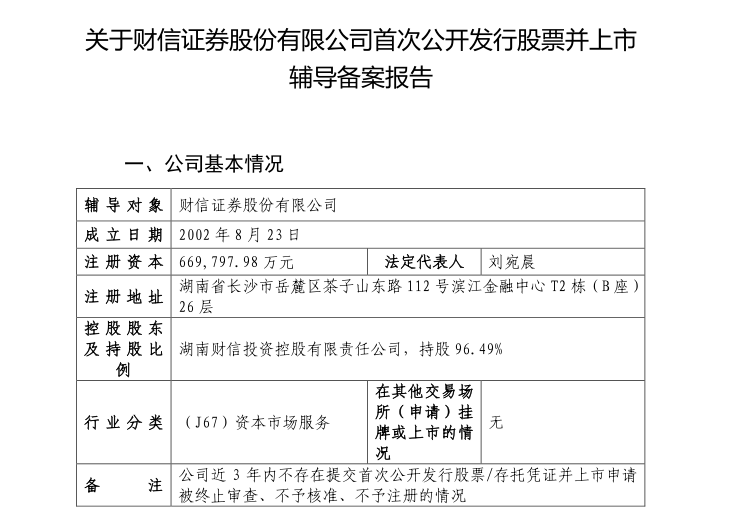 近日,证监会官网上公布了关于财信证券股份有限公司首次发行股票并上市辅导备案报告(以下简称辅导备案)。