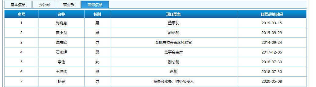 领导层方面,中国证券业协会显示,财信证券董事长为刘宛晨,历任财富证券投资银行总部董事副总经理,财富-里昂证券有限责任公司投资银行总部执行董事。