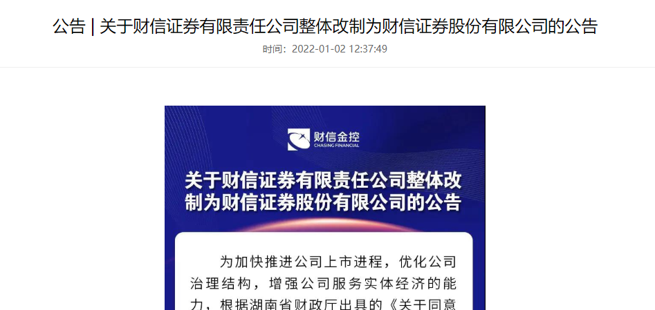 今年1月2日,财信证券官网宣布,财信证券有限责任公司整体改制为财信证券股份有限公司,这被外界解读为上市前的重要节点。