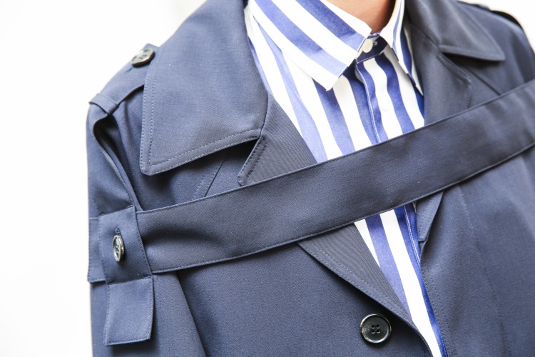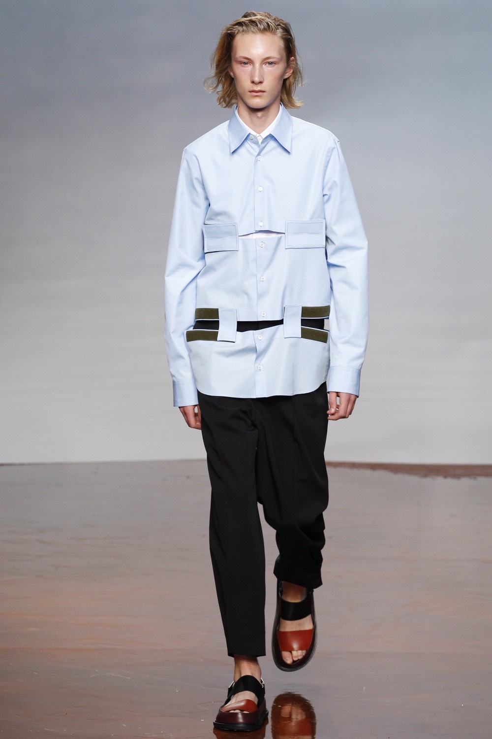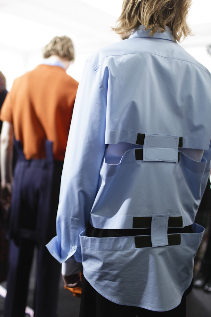 只是这种小伙子看久了还是容易疲劳,幸亏新系列有所进步:最吸引人眼球的是环绕在西装夹克、风衣胸线上方一周、用纽扣和袖子相连的带子,以及布满衬衣的Velcro尼龙搭扣,这个从户外、运动功能性服饰、球鞋中获取的灵感几乎成了时装界人人都爱的万金油——如果你想让你的作品摆脱恒古不变的乏味,看起来更有趣,那就用Velcro尼龙搭扣吧!就像乐高仍能吸引某些年过而立的大男孩一样,这种由瑞士发明家George de Mestral在上世纪40年代发明的小东西甚至能赢得那些时装门外汉的注意力:瞧,这衣服拆开还能粘回去呢——衬衣和裤子上都用到了这种搭扣,一是用做调节衬衣腰部松紧,二是分别成为连接衬衣、裤腰和衣身及裤腿的工具。