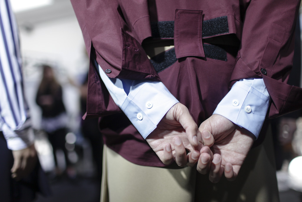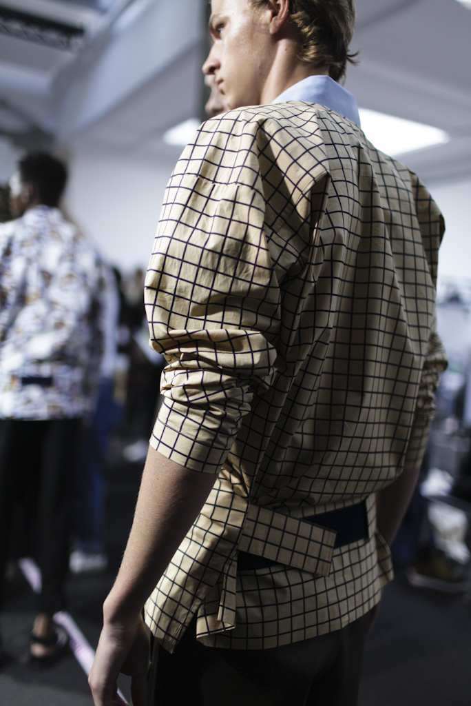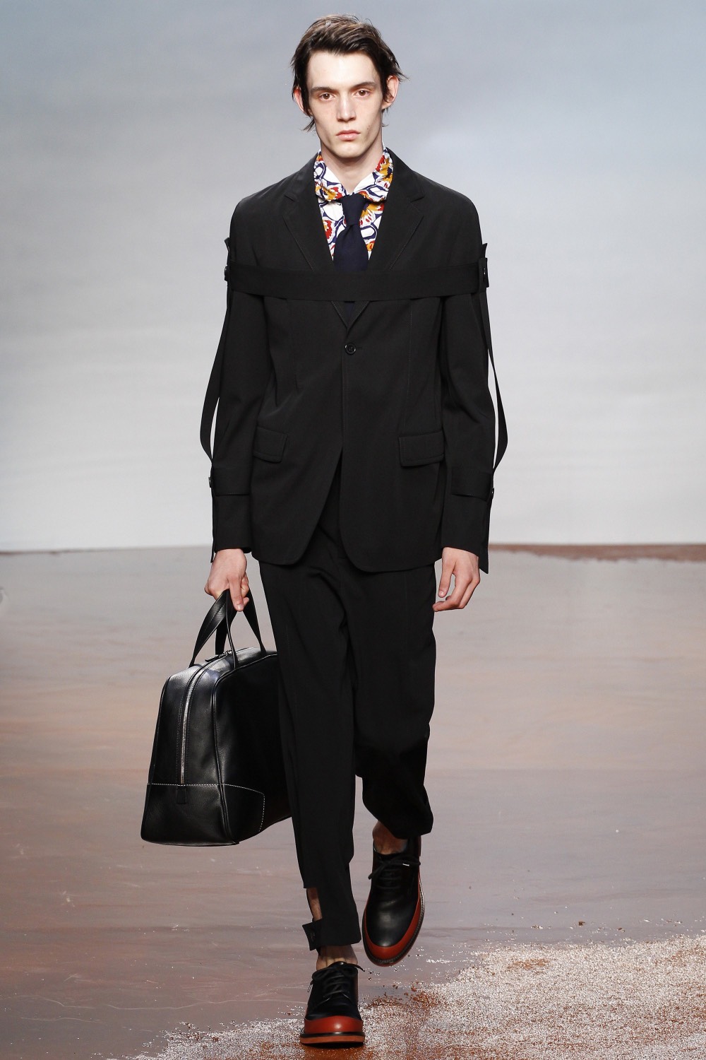 至于在外套上出现的犹如裁缝量身时用到的卷尺式的带子,让人回想起Raf Simons为其2013秋冬男装系列设计的、装饰在西装驳领间的梯形横截面——当然不是指责Marni在抄袭Raf Simons(类似手法Helmut Lang、Dries Van Noten、Martin Margiela等一拨人都爱用),就像大部分灵感迸发是来自错觉一样,Consuelo Castiglioni的这个点子有可能是在某次试装或是在哪部电影中看到的被捆绑的病人的一幕而来的(你也可以说是来自BDSM文化,但只是很难想象Consuelo Castiglioni也会有如此爱好)。