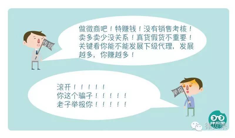 所以,如果有人跟你说,“做微商吧!特赚钱!没有销售考核!卖多卖少没关系!真货假货不重要!关键看你能不能发展下级代理,发展越多,你赚越多!”你可以直接跟他讲:“滚开!你这个骗子!老子举报你!”