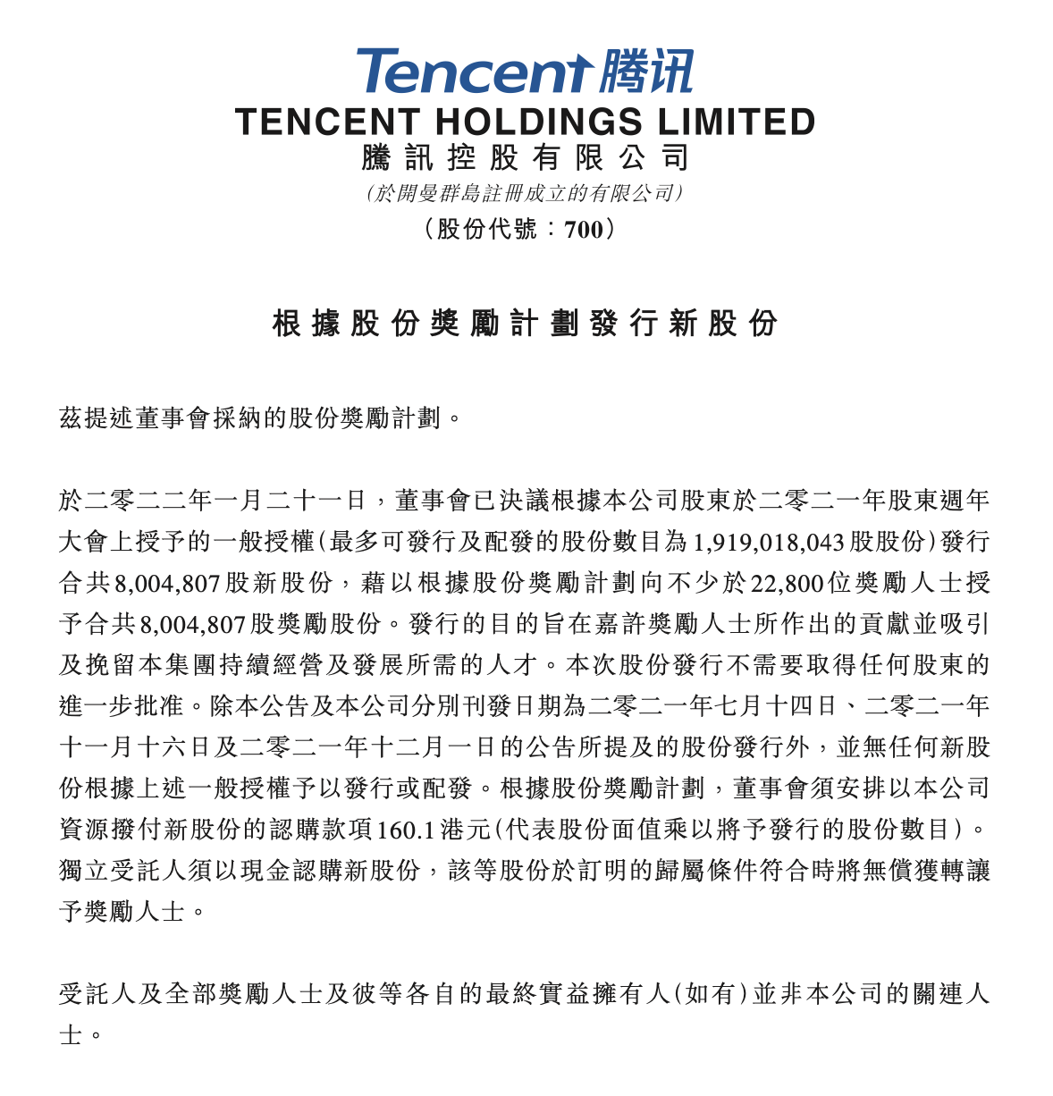 腾讯控股1月21日晚间公告,董事会已决议根据公司股东于2021年股东周年大会上授予的一般授权发行合共8,004,807股新股份,借以根据股份奖励计划向不少于22800位奖励人士授予合共8,004,807股奖励股份。公告称,发行的目的旨在嘉许奖励人士所作出的贡献并吸引及挽留集团持续经营及发展所需的人才。