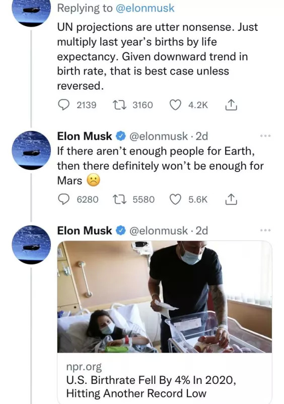 这次的警告不是一条推特,而是一串。他不仅援引“2020年美国出生率创新低”“全球出生率骤降预测”等报道,还重提联合国的“世界人口前景”预测,称其对未来将“人口过剩”的判断是无稽之谈。