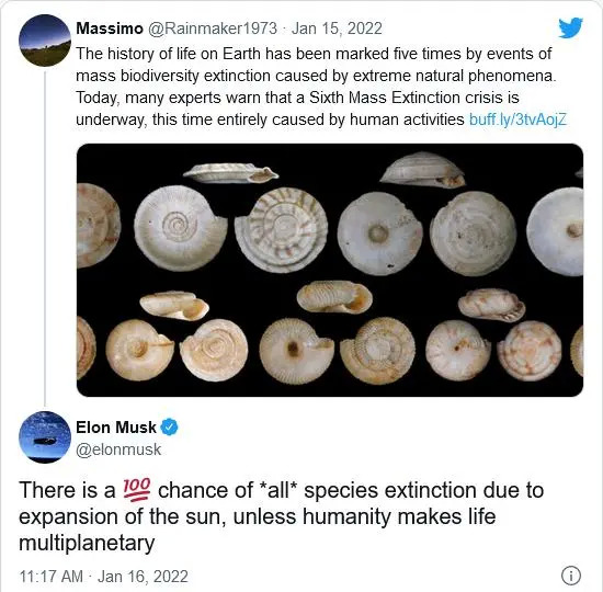 前几天马斯克还在推特中说:“太阳膨胀可能会导致地球上所有物种灭绝,包括人类。只有让生命多行星化,才可以避免这种命运。”