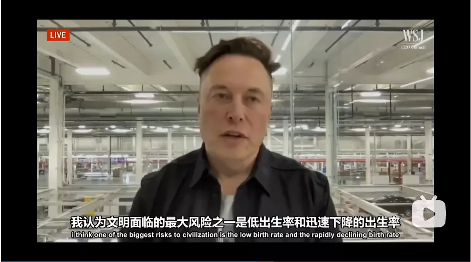 疫情之后的这两年,马斯克似乎愈发焦虑,提及人口问题的频率也在提高。就在刚刚过去的12月,华尔街日报CEO峰会上,马斯克就呼吁大家多生孩子,人口不够,文明将会崩溃。