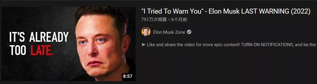 这甚至已经成为国外视频博主的取材宝库,在油管搜索相关关键词,可以看到若干马斯克的警告集锦,或者对某一警告的解读。其中最高的视频播放量超过700万,超过100万的视频也有超过10个。