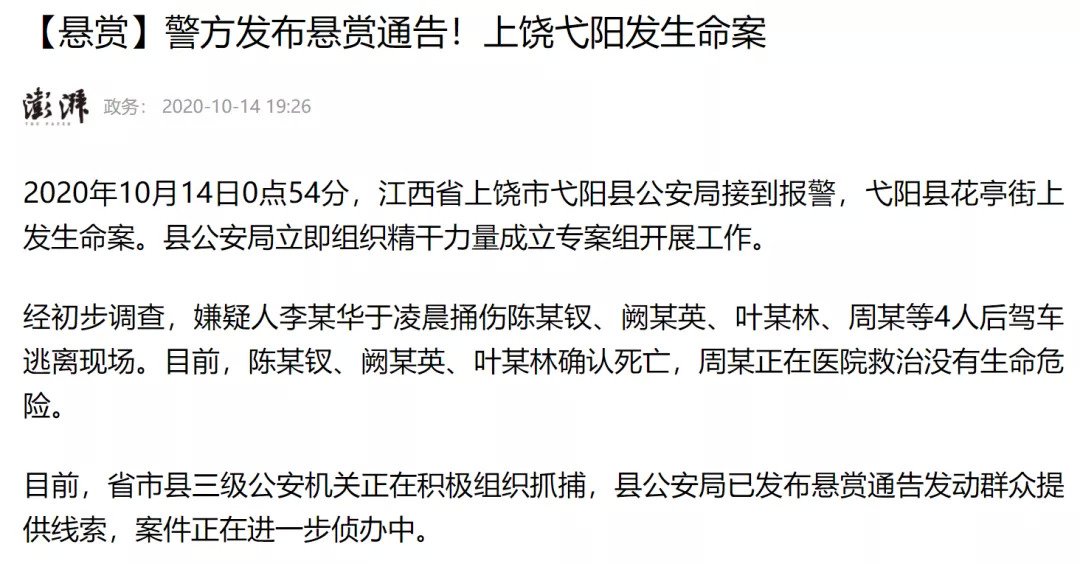 就拿发生在去年的一起悬赏命案为例:当时江西省弋阳县发生了一起重大刑事案件,为了尽快破案,警方设置了非常可观的悬赏金额。