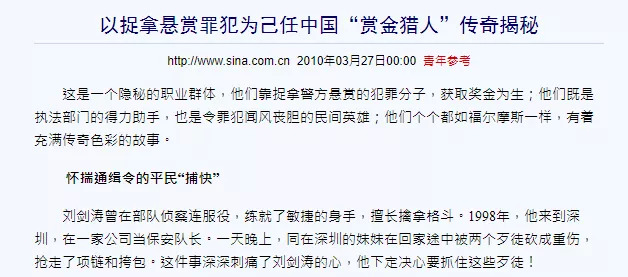 能够推动警方进行“悬赏追捕”,基本都是这类凶险的案情等级。截至目前,我上网能搜到敢于接单的国产保释金猎人,只有一个叫刘剑涛的人。