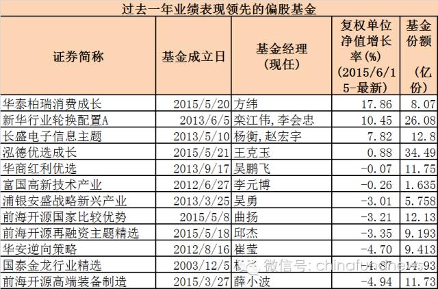 另外,兴全基金经理谢治宇管理着兴全合润和兴全轻资产,两只基金份额合计超过45亿份。自去年6月15日到目前,两只基金的跌幅均在6%附近。华商基金吴鹏飞管理的两只老基金:华商红利优选仅微跌0.07%,华商优势行业跌5.29%。国泰基金经理杨飞管理的国泰金龙行业精选和国泰估值优势均有不错的表现。