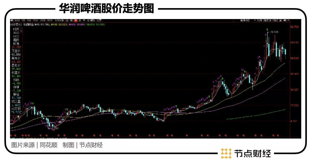 这样的业绩,表现在资本市场上,让华润啤酒挺住了去年消费股回调的大环境,仍维持在高位区间。截至1月21日收盘,公司股价为60.9港元/股,相比78.13港元的历史最高价,回调幅度在22%左右,总市值为1976亿港元。