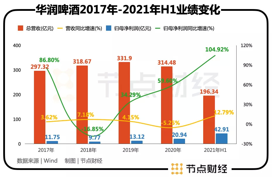 截至2021年半年报,华润啤酒总营收为196.34亿元,同比增幅12.79%,相比疫情前的2019年增幅4.3%;同期归母净利润为42.91亿元,同比增幅约106%,相比2019年增幅约129.34%。