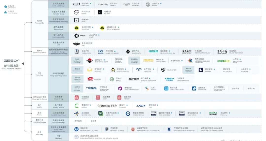 目前,吉利在乘用车领域,拥有吉利汽车集团、沃尔沃汽车集团、极氪智能科技、路特斯集团、智马达汽车、英伦电动汽车等6大板块,是投资最为丰富与集中的领域,各板块下还往往包括多个汽车品牌。