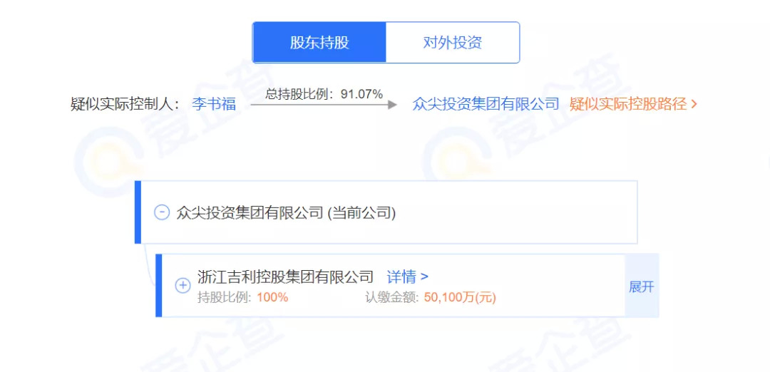 2021年1月,由吉利控股全资控股的众尖投资有限公司成立,注册资本达到5.01亿元人民币,李书福持股91.07%,法定代表人为李东辉,这被外界视为吉利控股加码资本运作和金融服务的重要信号。
