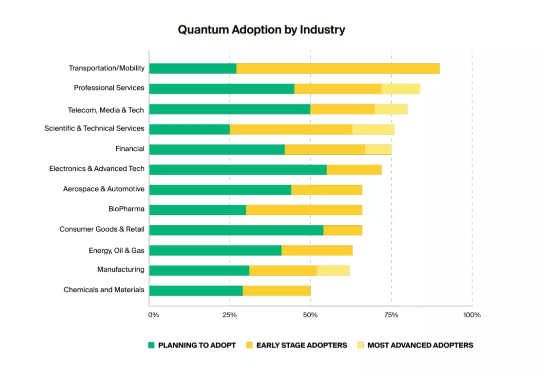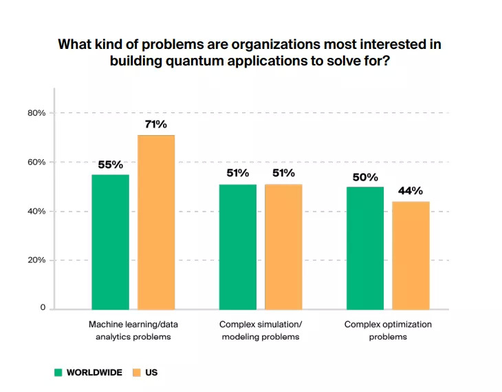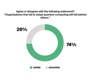 企业量子软件公司Zapata曾发布了一份《企业量子计算采用的年度报告》,调查了300多家大型全球企业的CIO、CTO及高管,数据显示,74% 的高管认为要么尽快采用量子计算,要么面临永远落后的风险。而在已经开始构建量子能力的企业中,41%的人希望在未来两年内实现竞争优势,领先于同行。