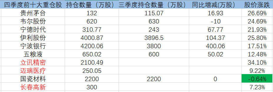 从股票涨跌幅来看,前十大重仓股中,除了国瓷材料(300285.SZ)股价略有下跌外,其余重仓股股价均有所抬升。