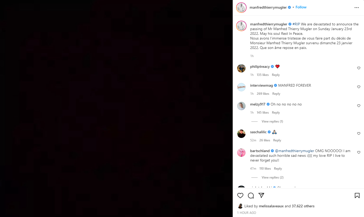 法国知名时装设计师Thierry Mugler的官方Instagram账号24日发布声明称:“我们非常悲痛地宣布Manfred Thierry Mugler先生于2022年1月23日去世。愿他的灵魂得到安息。”