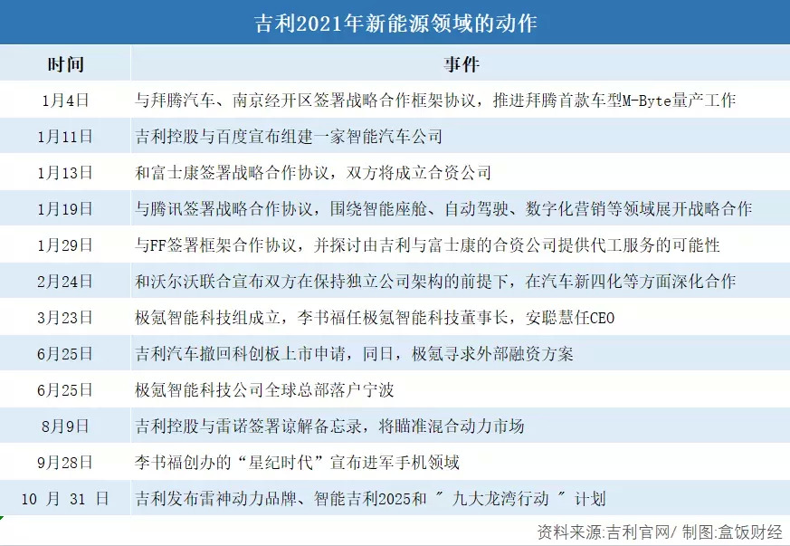 从今年的动作来看,李书福对于吉利的转型已经迫在眉睫。如在1月份,与腾讯签署战略合作协议,围绕智能座舱、自动驾驶、数字化营销等领域展开战略合作;10 月份,吉利发布 " 九大龙湾行动 " 计划, 5年研发投入1500 亿元、2025 年实现自动驾驶全栈自研以及 5年内推出 25 款以上全新智能新能源产品等。