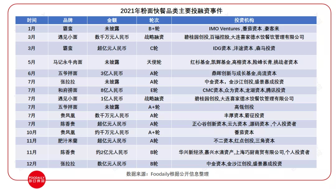 在中国人的饮食基因中,粉面三餐皆可食,场景丰富,丰俭由人,是不少消费者的第一主食选择。2021年,粉面品类集中爆发,成为诸多投资机构眼中的“香饽饽”:定位中式面食的和府捞面完成8亿人民币E轮融资;主打兰州拉面的陈香贵、张拉拉获得超亿元人民币融资;湖南牛肉米粉品牌霸蛮完成超亿元人民币融资······
