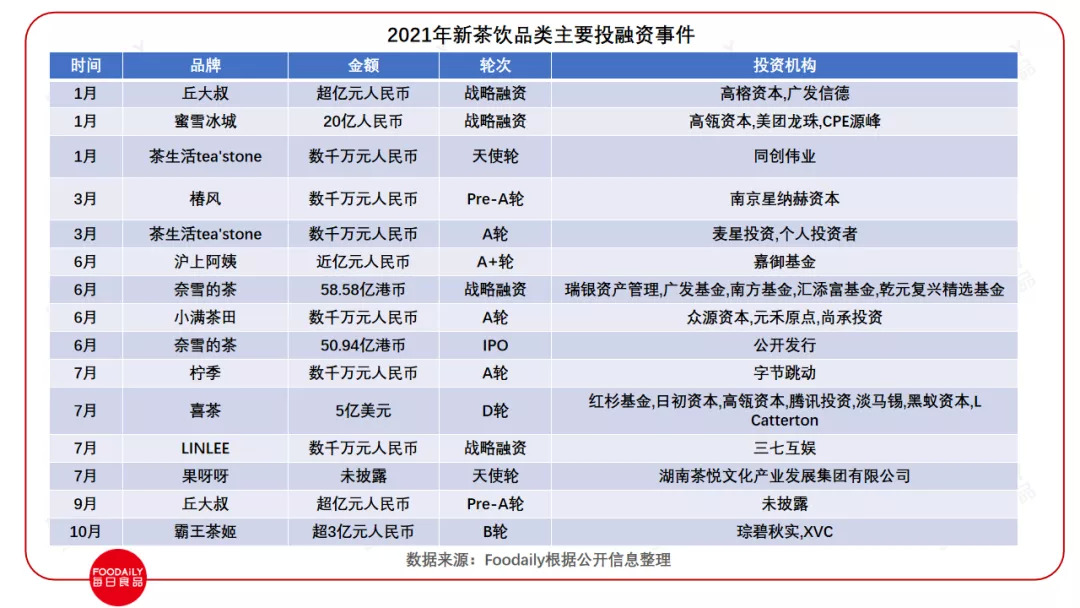 资本竞相涌入,品牌迅速扩张,新茶饮赛道跑马圈地和红海竞争的速度,远比想象中更快。公开数据显示,仅2021年上半年,新茶饮融资事件数及金额就超过了2020年全年水平。继“奶茶第一股”奈雪的茶上市敲钟后,其余头部、腰部茶饮品牌不断传出冲刺“奶茶第二股”的消息。