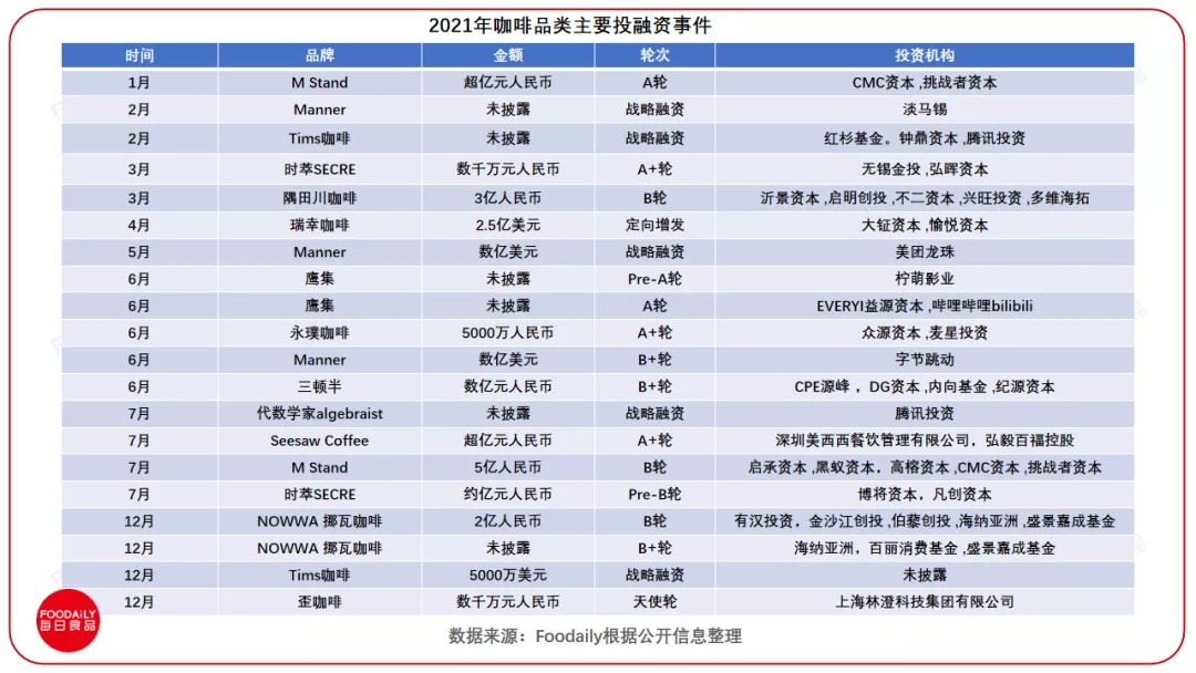 据不完全统计,2021年咖啡市场共发生26起投融资事件。获得融资的16家咖啡企业中,有7家融资金额过亿,他们分别是:M Stand、Manner、隅田川、Seesaw、挪瓦咖啡 、三顿半、时萃。部分热门品牌甚至在2021上半年就已完成2轮或3轮融资。