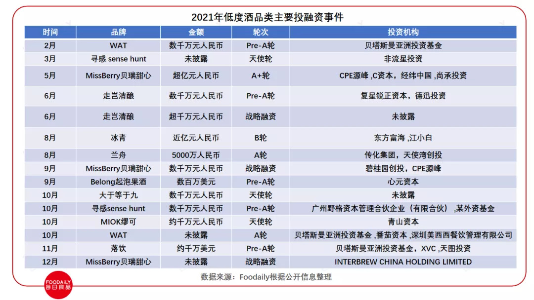 低度酒赛道中不仅有天图投资、经纬中国等耳熟能详的老牌投资方,百威、泸州老窖等传统酒业的“老玩家”,可口可乐、农夫山泉等饮料巨头也纷纷展开布局。