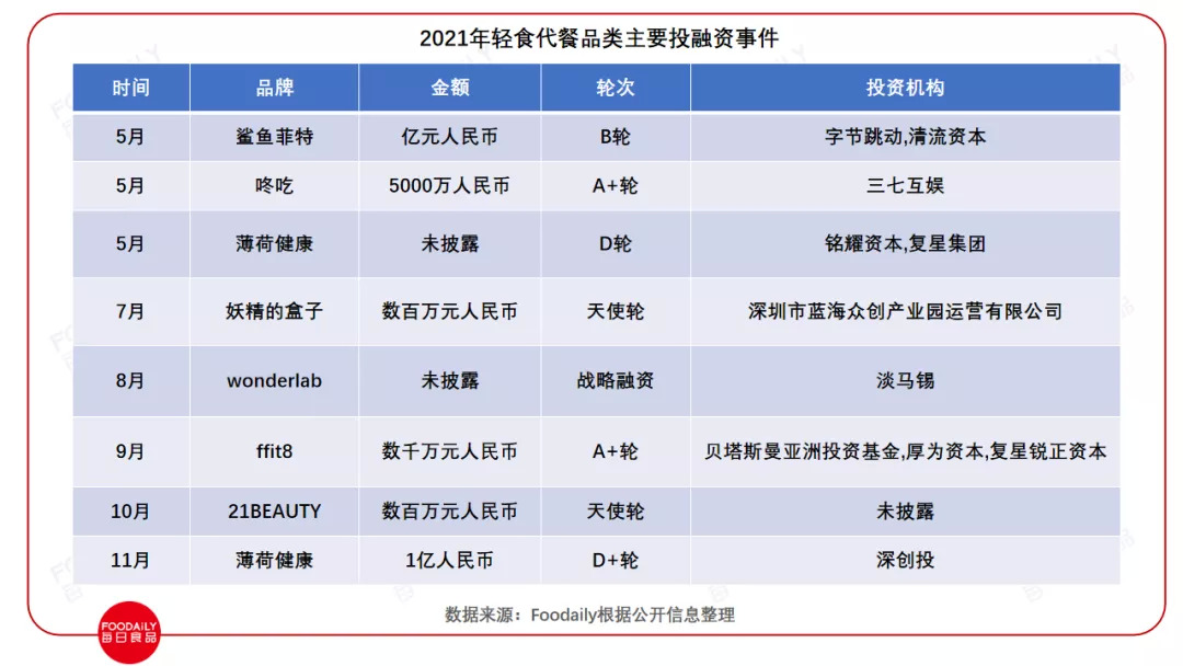 ffit8完成数千万人民币A+轮融资,鲨鱼菲特获得亿元级B轮融资,薄荷健康获1亿人民币D+轮融资······一批轻食代餐品牌正在强势崛起。