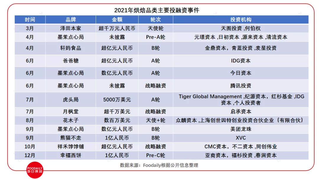 12月20日,幸福西饼对外披露完成1亿元战略融资,此次融资已经是幸福西饼的第五轮融资。9月24日,互联网烘焙品牌熊猫不走完成由XVC独家投资的1亿元B轮融资。