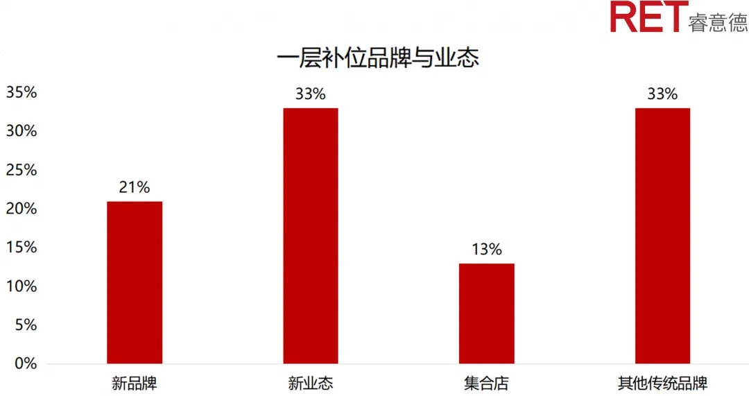 然而近年来诚如前文所言,以快时尚品牌为核心的次主力店军团也同样面临着新旧交替的周期性问题,在《快时尚下场,消费者选了谁来上场补位》一文中,RET睿意德曾分享最新的行业观察,新品牌、新业态在替代快时尚品牌的过程中,已占到50%以上的比例,而采取其他传统品牌作为面积消化手段的仅占33%。已充分说明了传统品牌作为主力店品牌集群的做法正在不被业界所采纳。同时我们也惊喜地发现了国潮品牌、个性化潮牌在购物中心里扮演的角色日益重要,并且在购物中心一层所占据的比例呈现出稳中有升的气象。