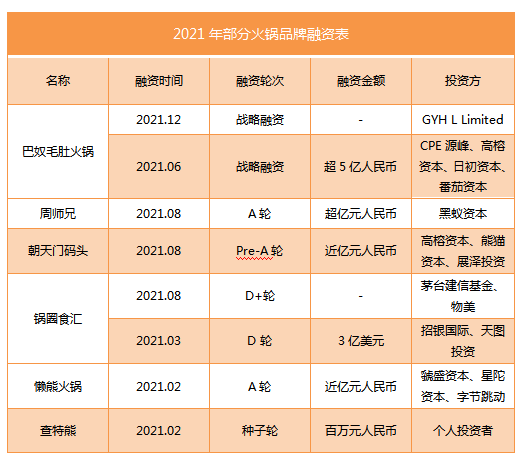 企查查数据显示,据不完全整理,近半年来,近30亿元资本涌入火锅行业,火锅行业上下游企业接连融资,背后不乏IDG资本、字节跳动、高榕资本等专注消费的一线投资机构。2021年火锅品牌融资事件不多,但融资金额都很高。