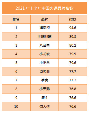 根据艾媒金榜数据,海底捞以94.6的指数摘得桂冠,呷哺呷哺、八合里分别以89.3、80.2的金榜指数位列第二名、第三名。当前的主流火锅品牌有着不同的特色,如海底捞主打高端服务、呷哺呷哺则以吧台式经营为特色。