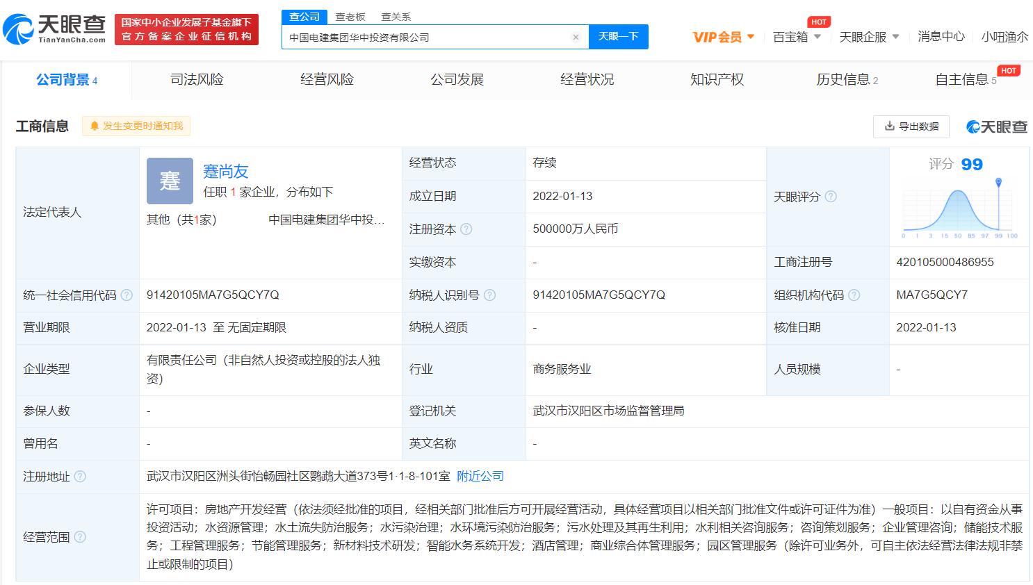 天眼查App显示,1月13日,中国电建集团华中投资有限公司成立,法定代表人为蹇尚友,注册资本500000万人民币,经营范围包括以自有资金从事投资活动;水资源管理;储能技术服务;工程管理服务;新材料技术研发;商业综合体管理服务;房地产开发经营等。股东信息显示,该公司由中国电力建设集团有限公司全资持股。