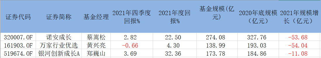 虽然年度回报率为正,但相比2020年底,三只基金规模均出现了缩水,仍属于百亿基金的梯队。截至2021年底,万家行业优选规模为138.99亿元,相比2020年底减少54.04亿元;诺安成长规模为274.08亿元,相比2020年底减少53.68亿元;银河创新成长规模为173.78亿元,同比减少了11.08亿元。