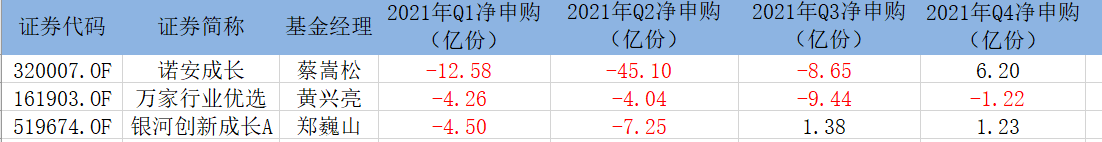 这主要是因为基民在2021年进行了大份额的赎回。Wind数据显示,去年四个季度,诺安成长在前三个季度均出现了净赎回,分别为12.58亿份、45.1亿份、8.65亿份。仅在去年四季度,首次出现了6.2亿份的净申购。