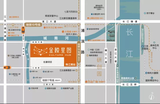 项目南边角就是已经开建的11号线珠江南站,TOD开发模式未来无缝搭乘地铁;门口就是城南河滨河绿廊和芝麻河,推窗即见滨水景观,距离万达广场、佳源Upark、京东等配套资源更近,西面与江北金陵酒店同样一街之隔,北面就是浦口中心医院,生活更便利。