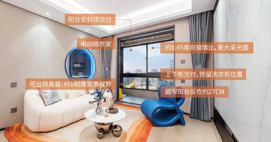 再对比一下周边的项目,几乎没有对手,带来的是更加阔绰的空间感;南向立面的窗墙比约0.45,差不多半个立面都是窗户,足以见得室内采光会有多好!阳台反坎设计仅约27cm(阳台地面外沿凸起的那一部分挡水条),意味着阳台封窗近乎是落地窗的观感,瞬间大平层的感觉就有了!