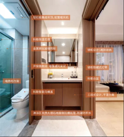 区别于传统的干湿分离卫生间,金陵星图建面约89㎡卫生间采用了三段式设计,将台盆设置在了卫生间门外,不仅避免水渍外溅,滋生细菌,更避免洗漱如厕同时使用的尴尬,非常便捷。